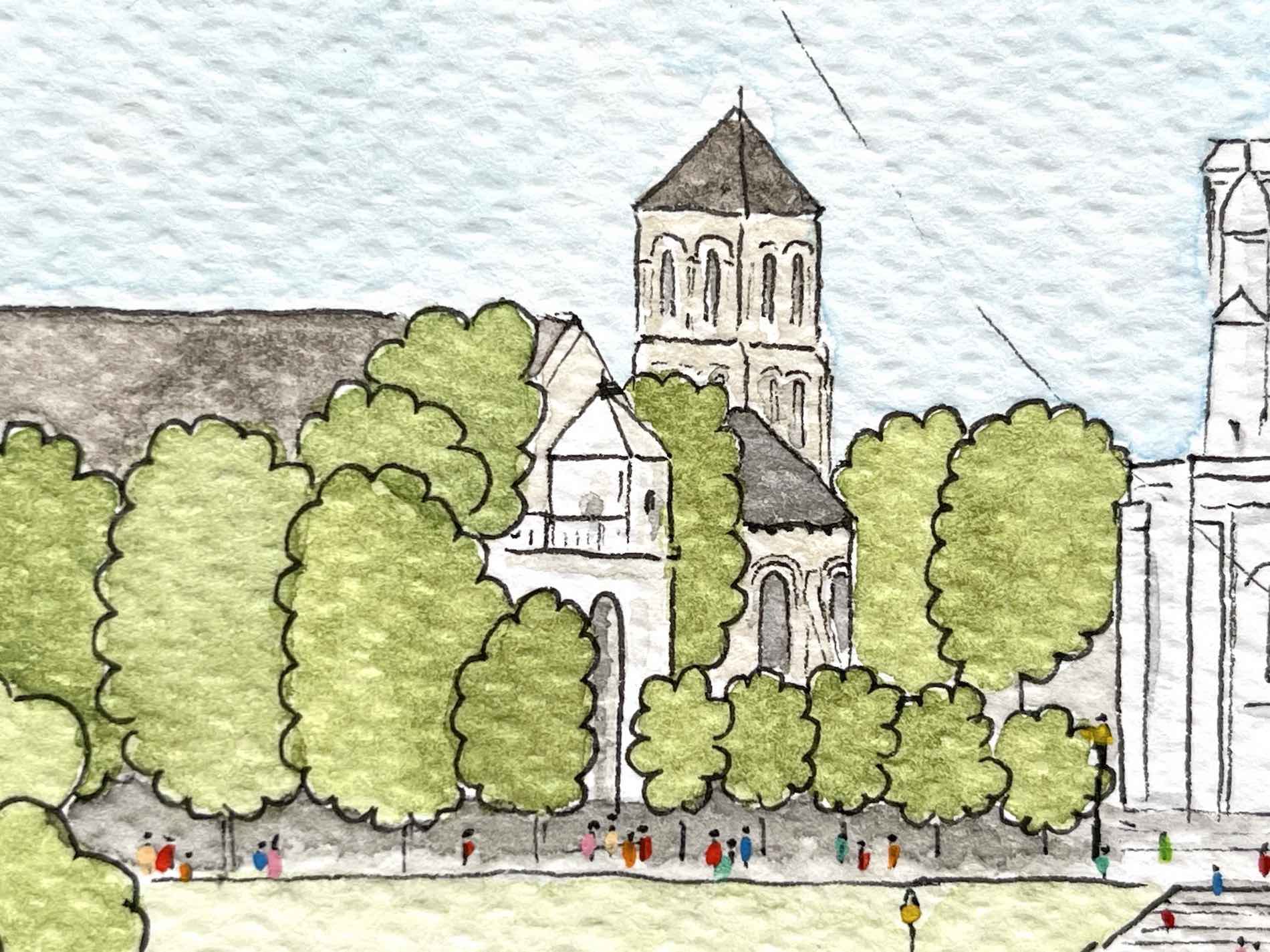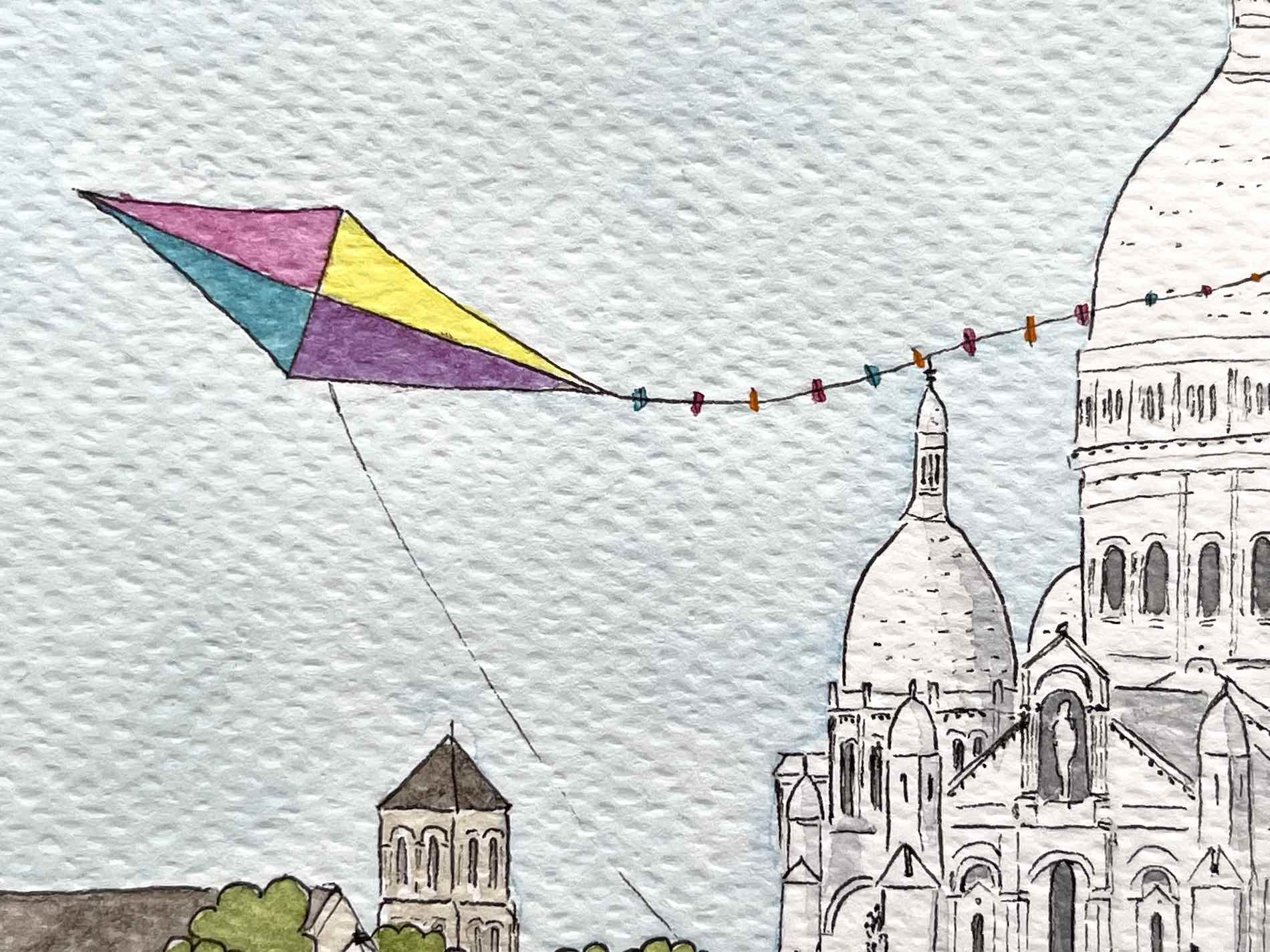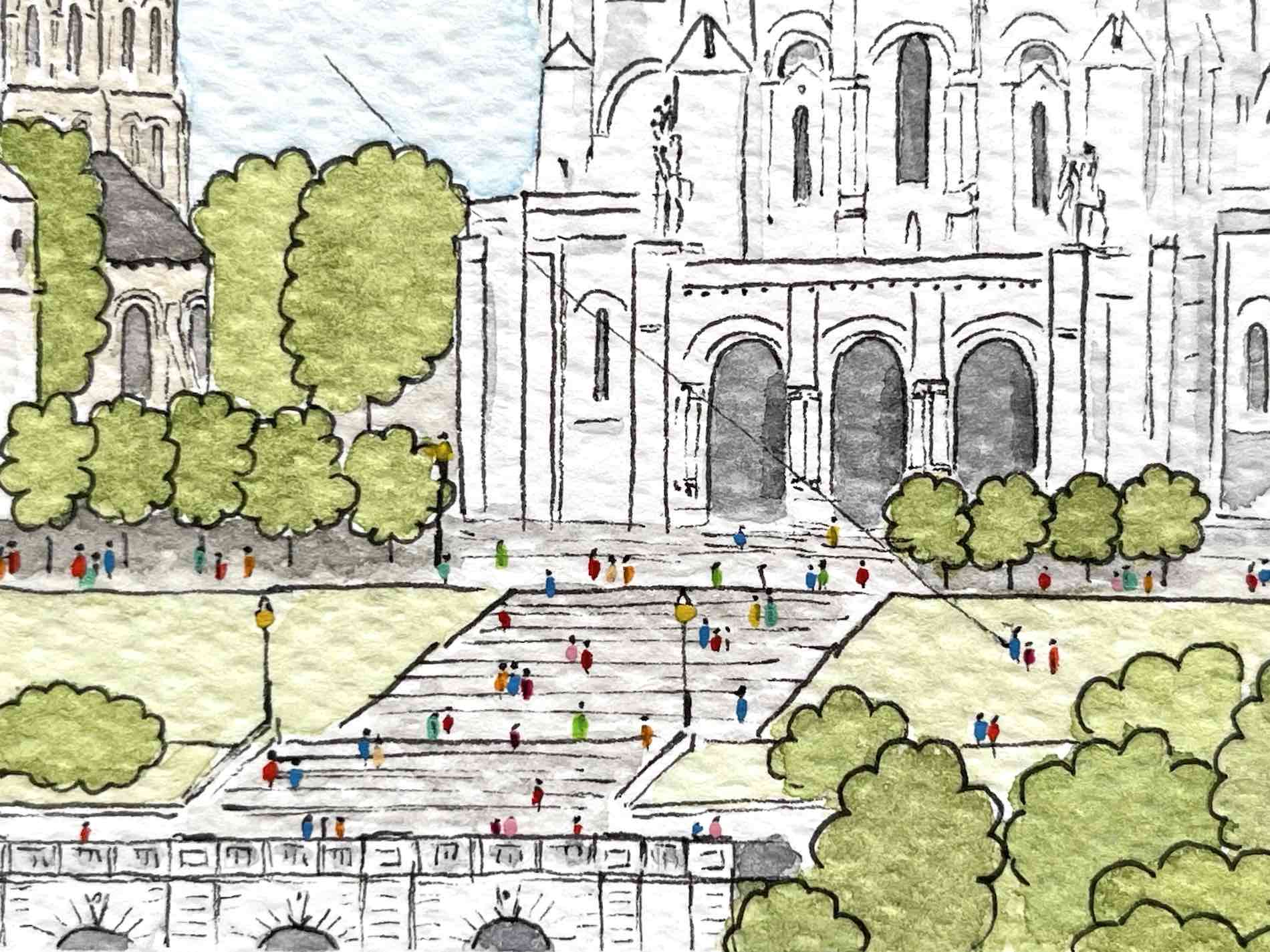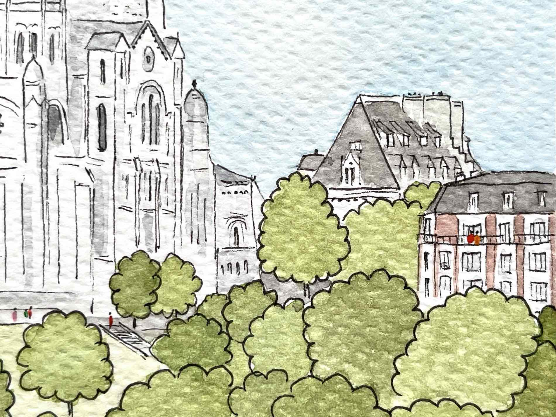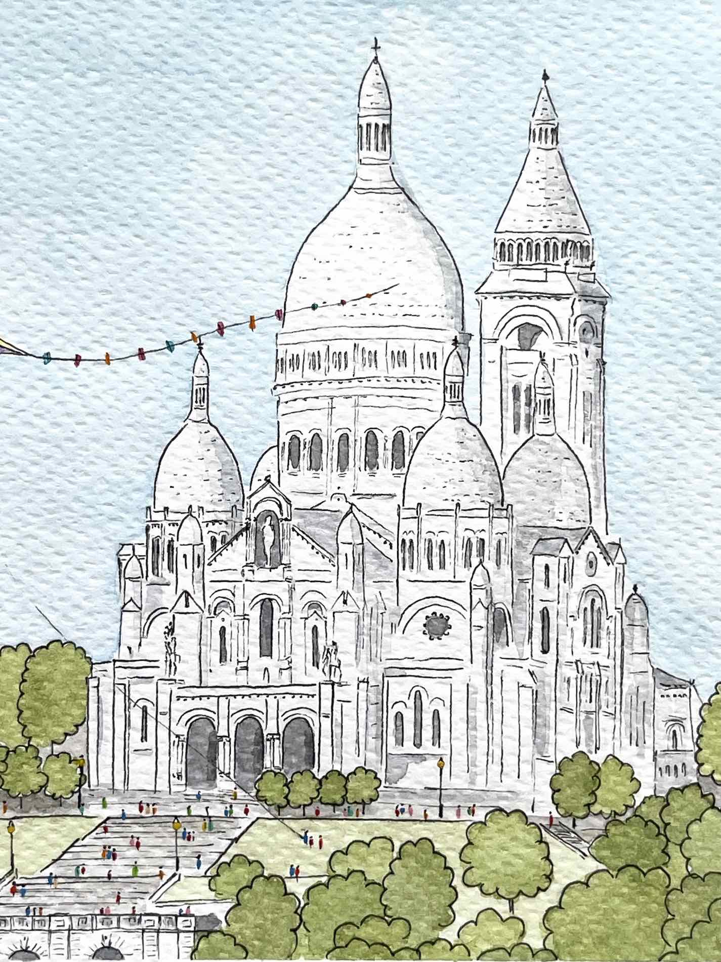 a view of the basilica located at the top of Montmartre Hill, offering a breathtaking panorama of the enitre city. This illustration could become a poster, postcard or greeting card. It can also be printed on bags, pouches, make up bags and many other products.
