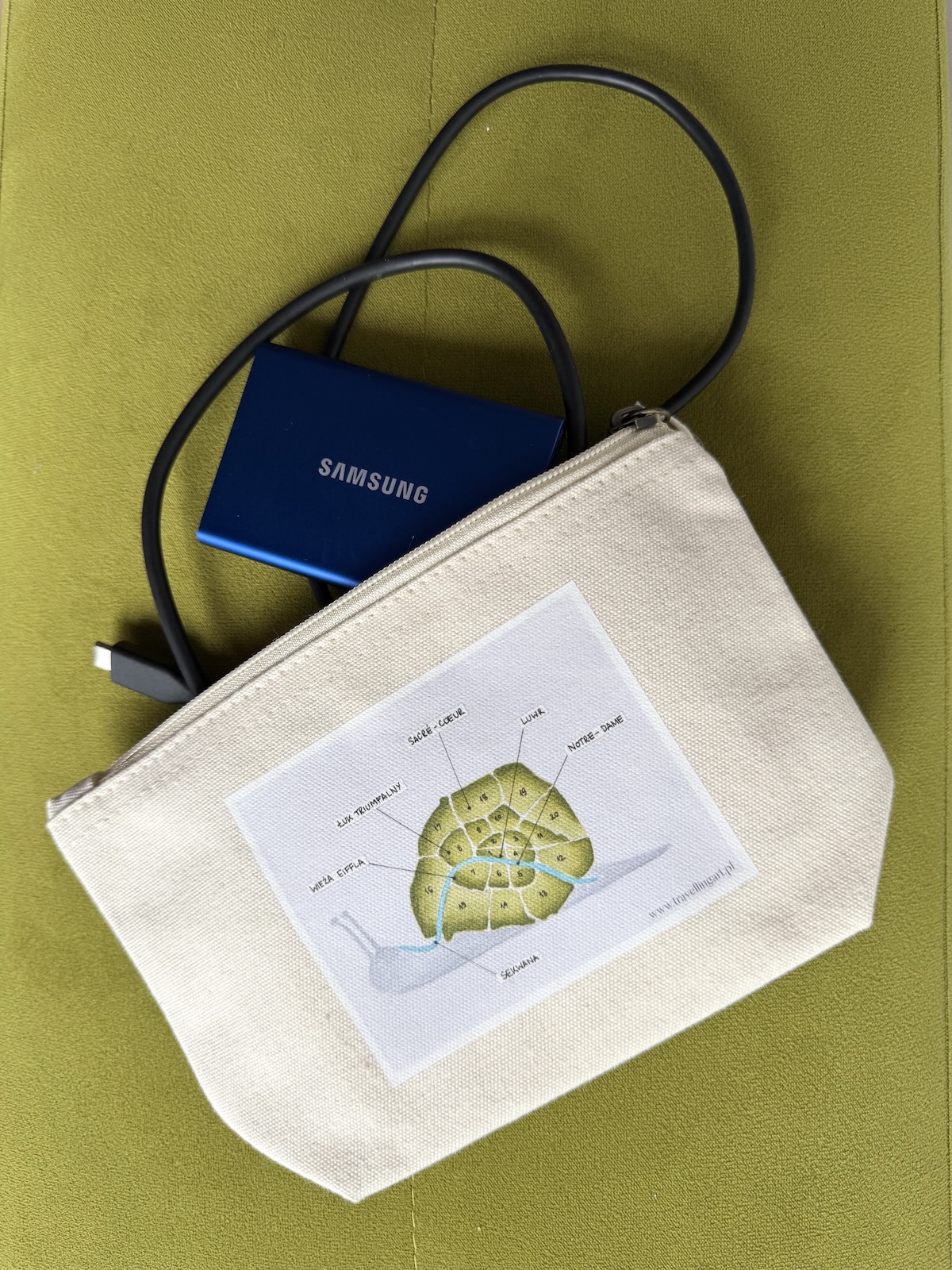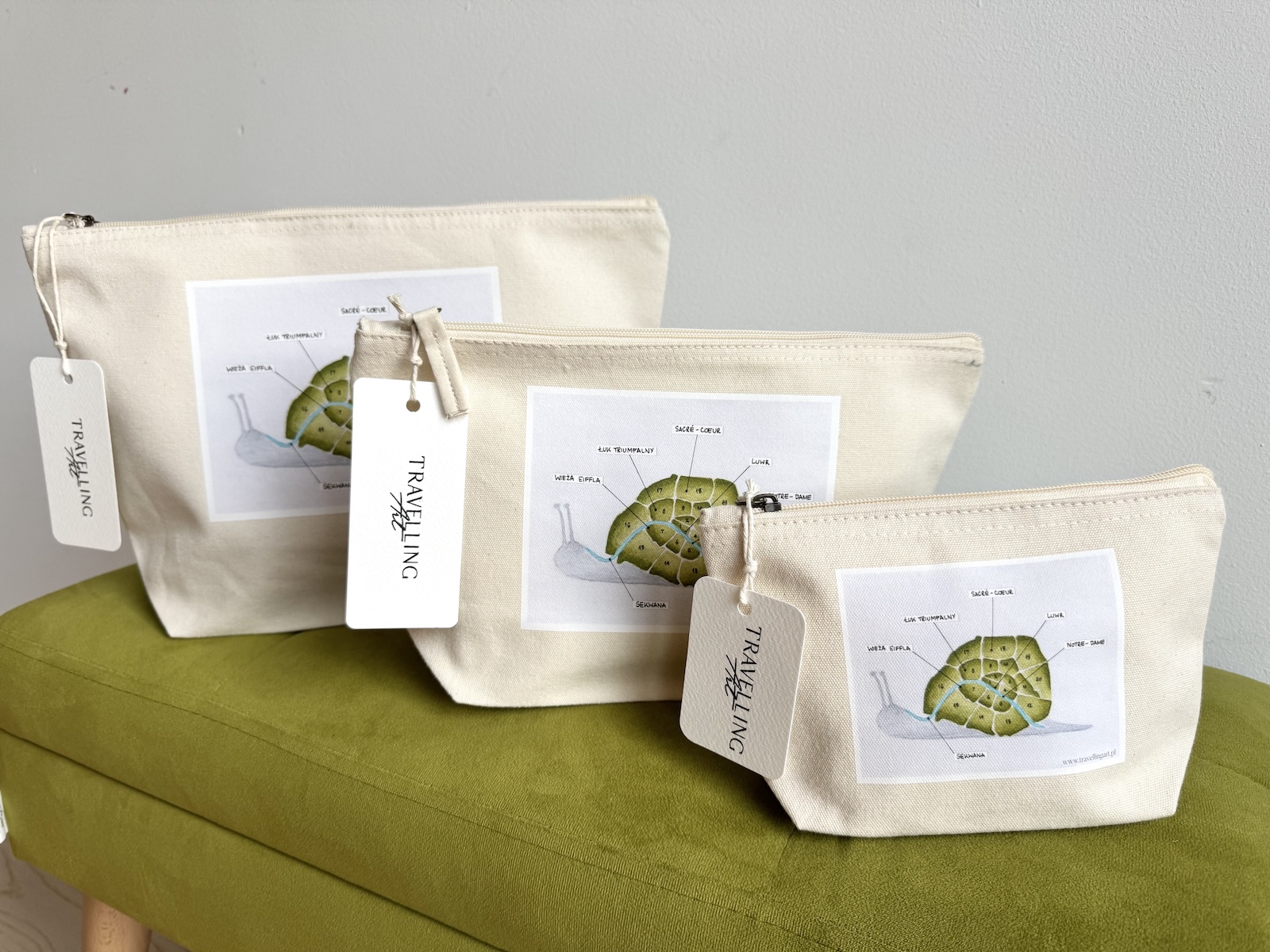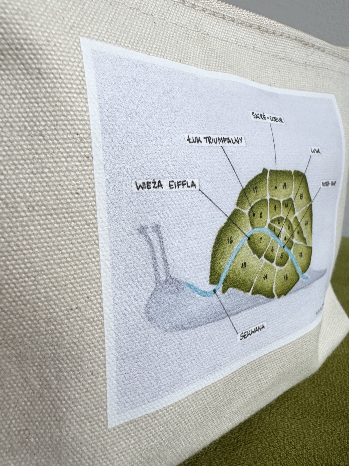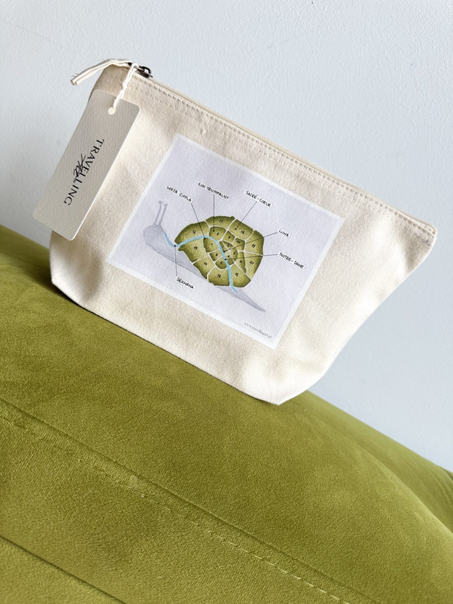 Pouches featuring a print of a snail - a spiral layout of Parisian districts.