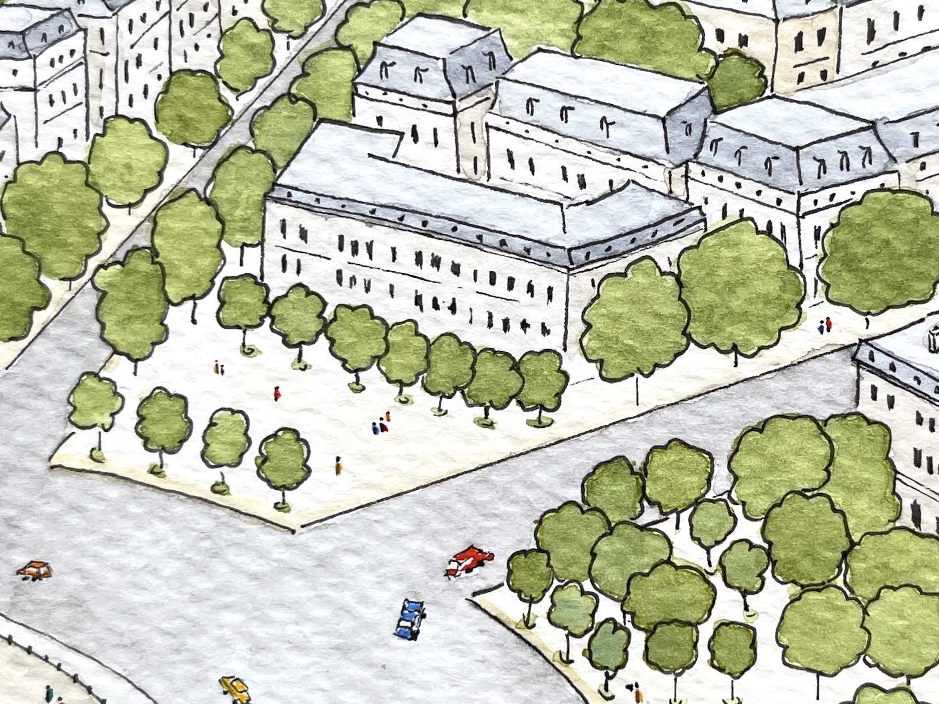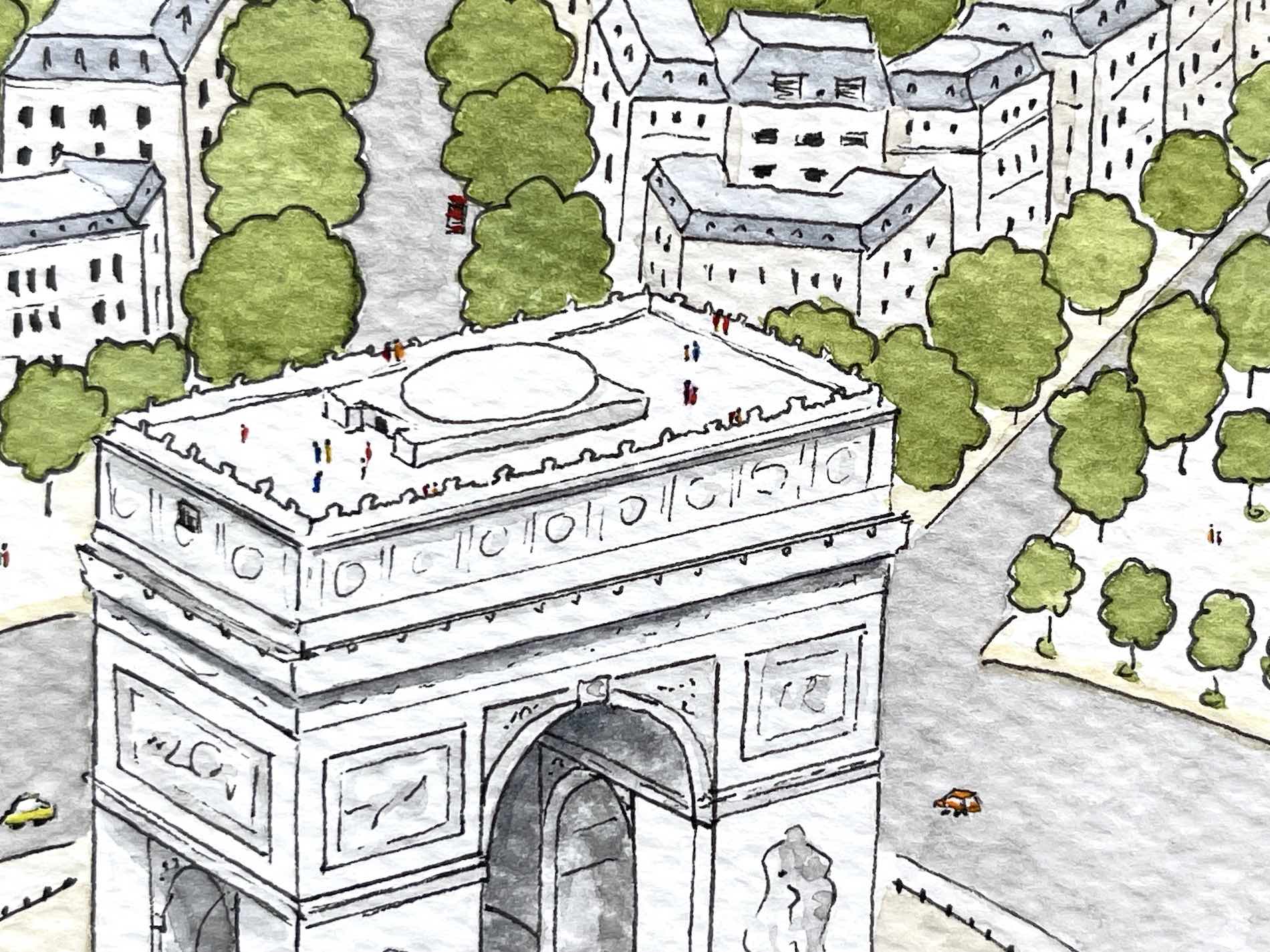 Widok na rondo Charles’a de Gaulle’a i stojący w jego centralnym punkcie Łuk Triumfalny – jeden z najbardziej znanych zabytków Paryża. Z tej ilustracji może powstać plakat, pocztówka, kartka… Istnieje możliwość nadruku na torbach, saszetkach, kosmetyczkach i wielu innych produktów9