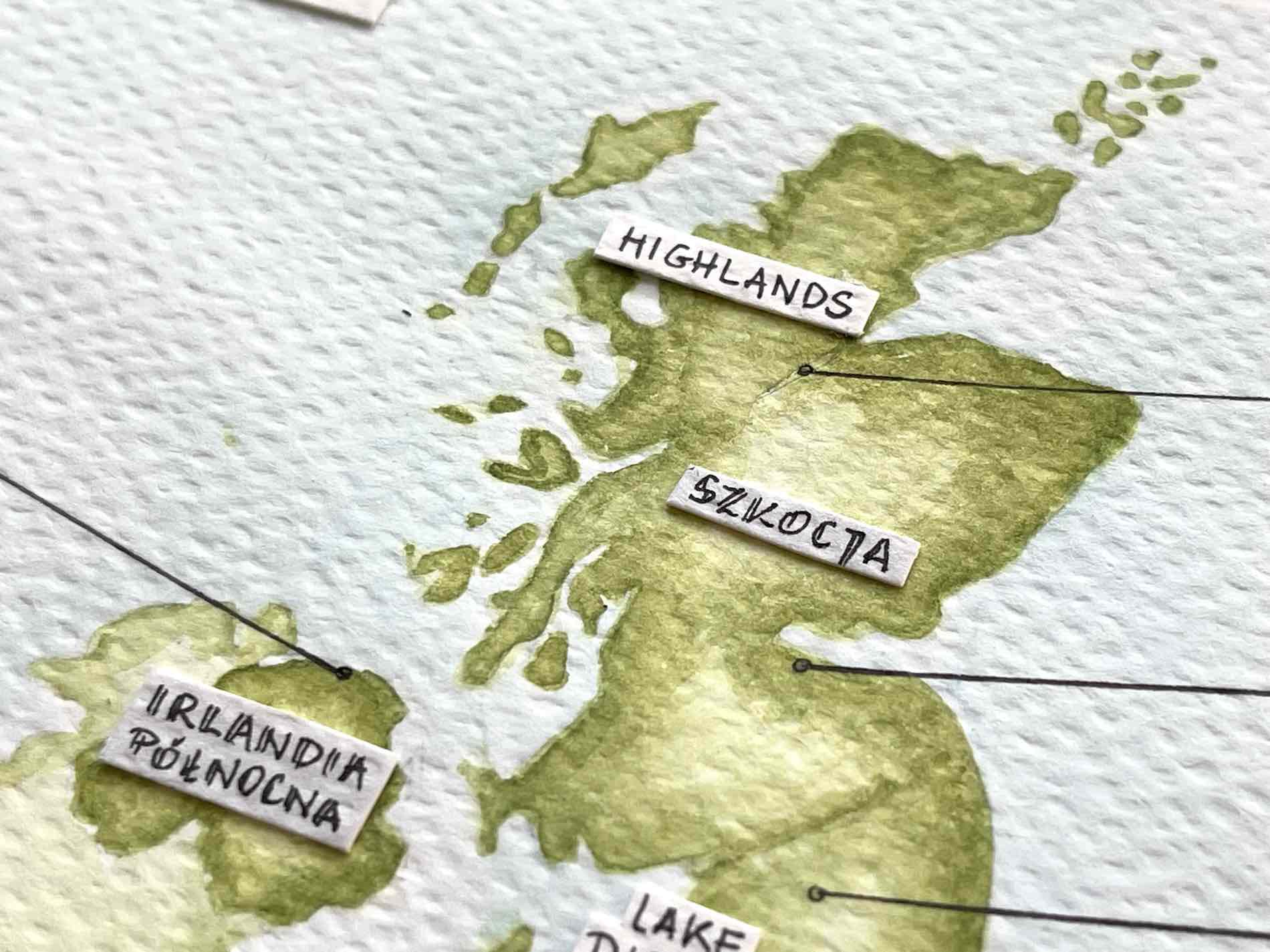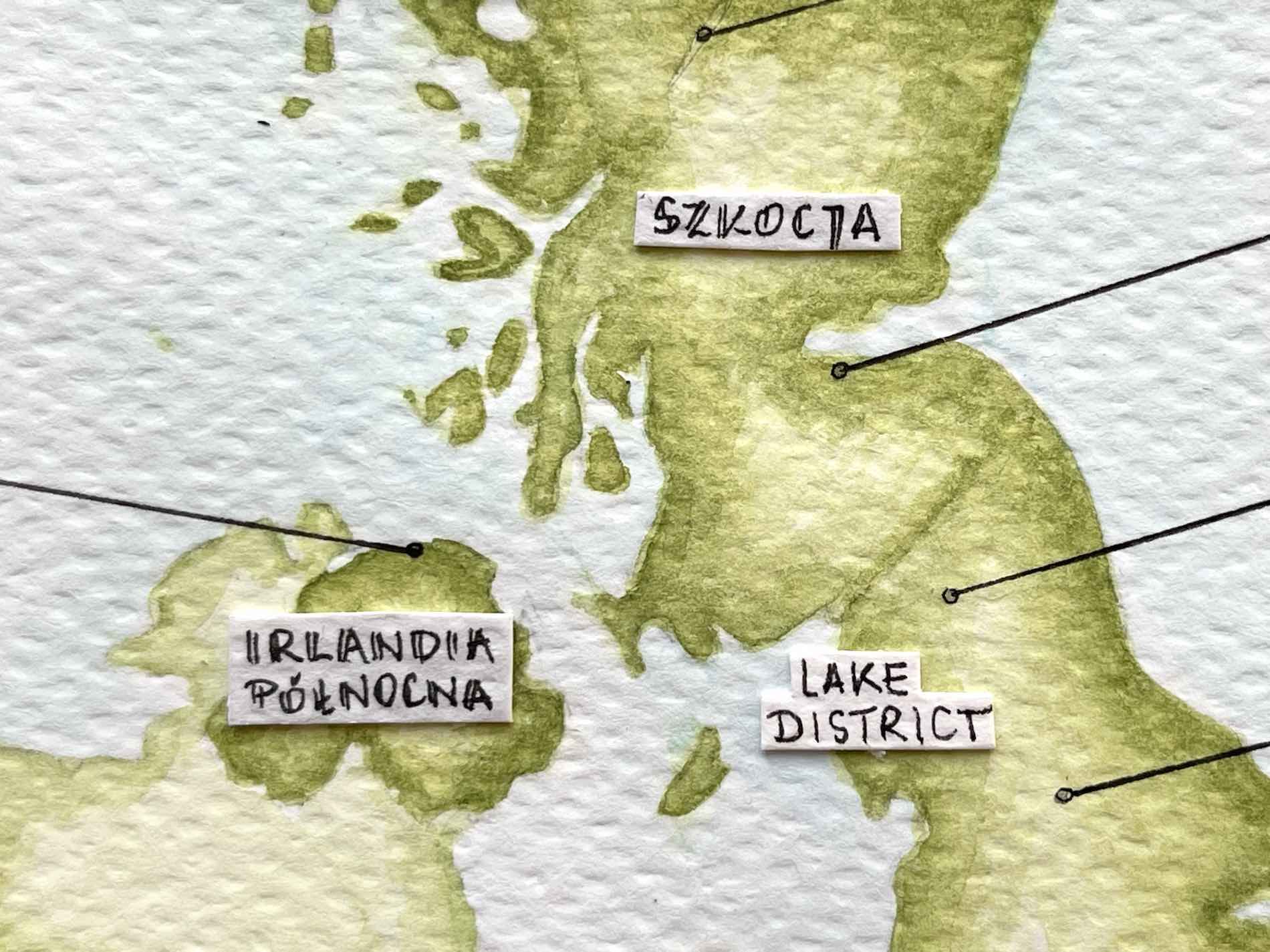 mapa Wielkiej Brytanii i niektóre z jej największych atrakcji. Z tej ilustracji może powstać plakat, pocztówka, kartka… Istnieje możliwość nadruku na torbach, saszetkach, kosmetyczkach i wielu innych produktach
