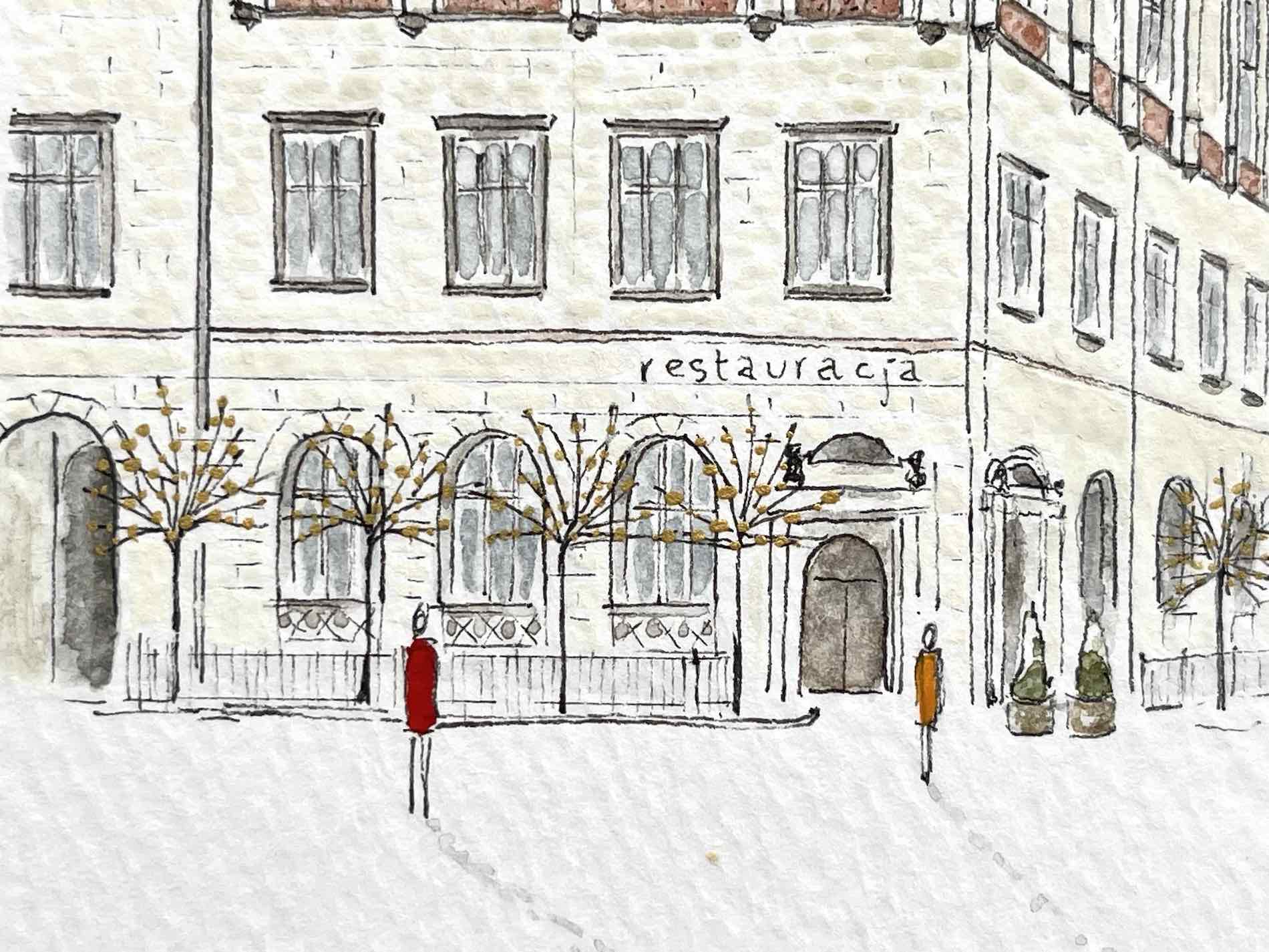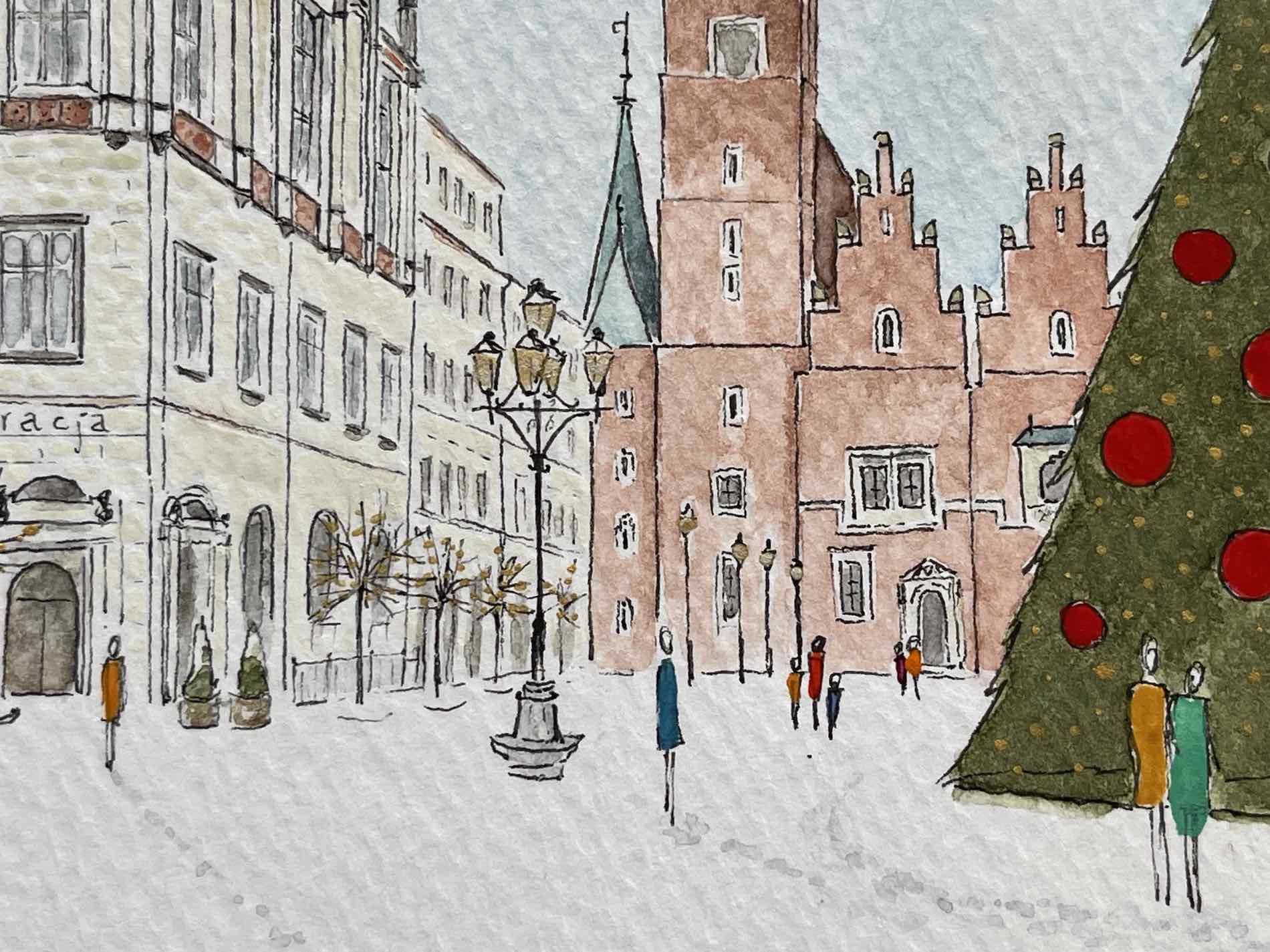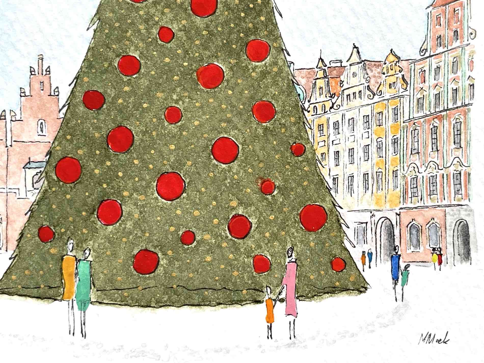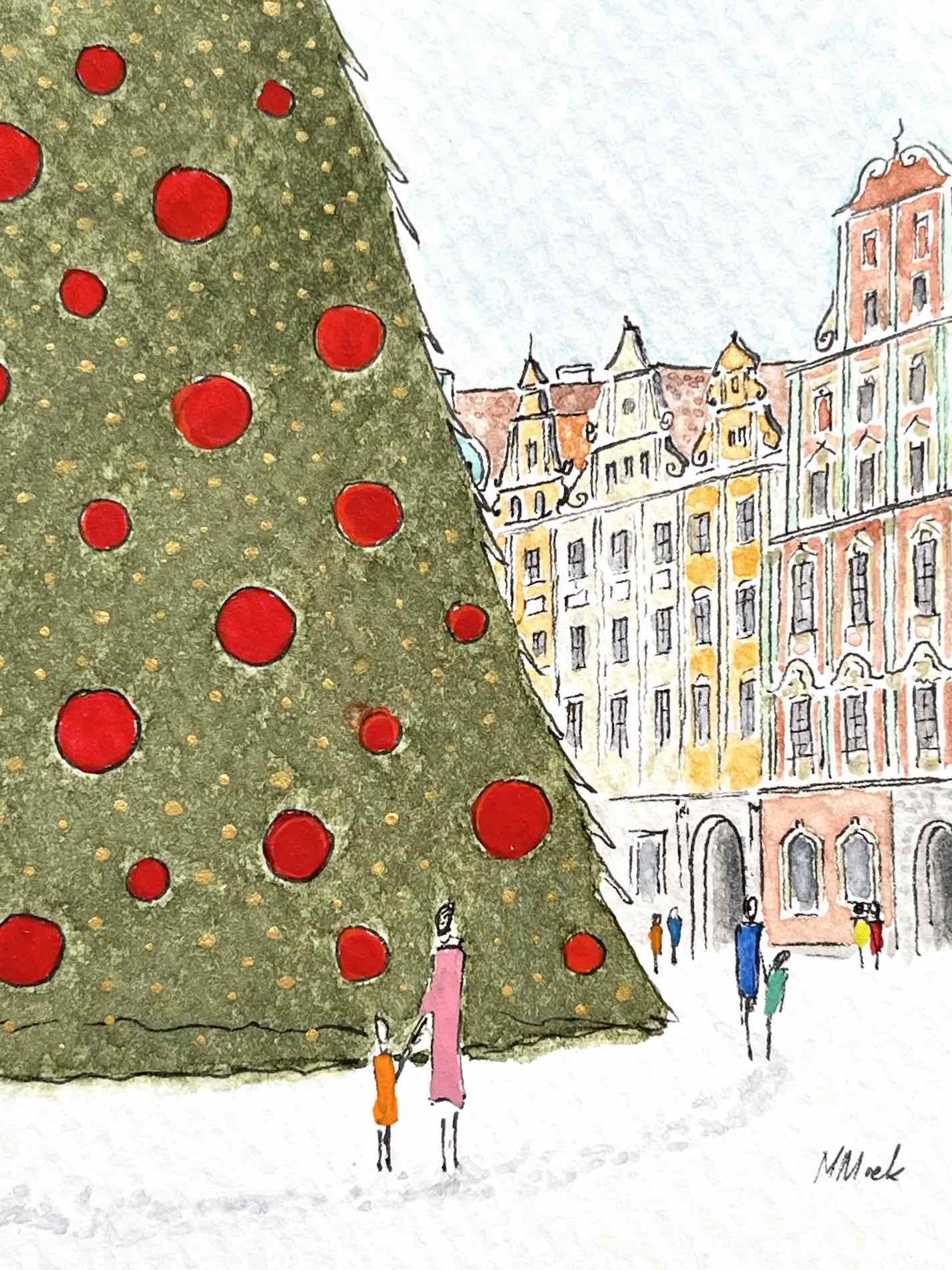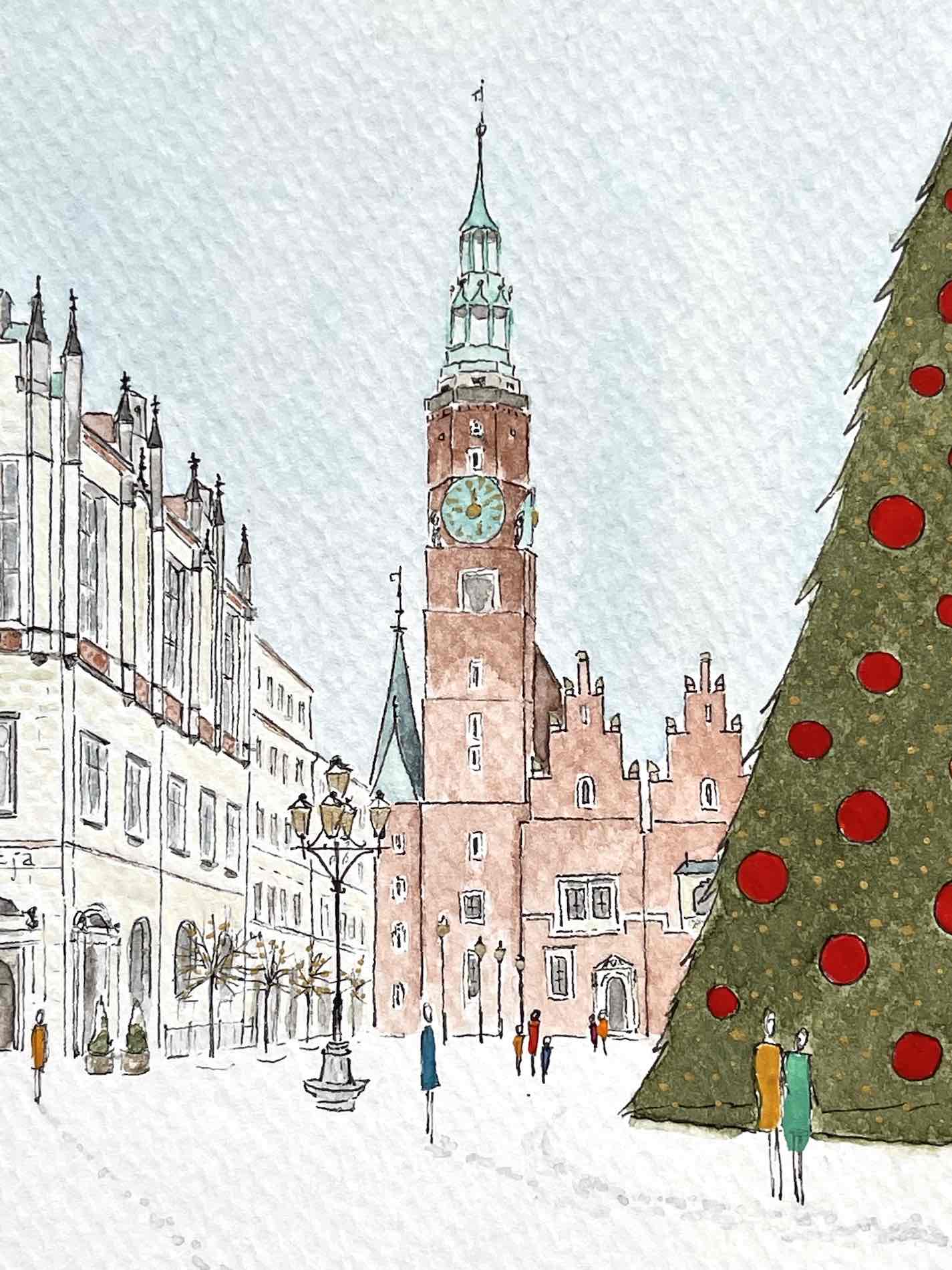 widok na świąteczny wrocławski rynek. Z tej ilustracji może powstać plakat, pocztówka, kartka… Istnieje możliwość nadruku na torbach, saszetkach, kosmetyczkach i wielu innych produktach