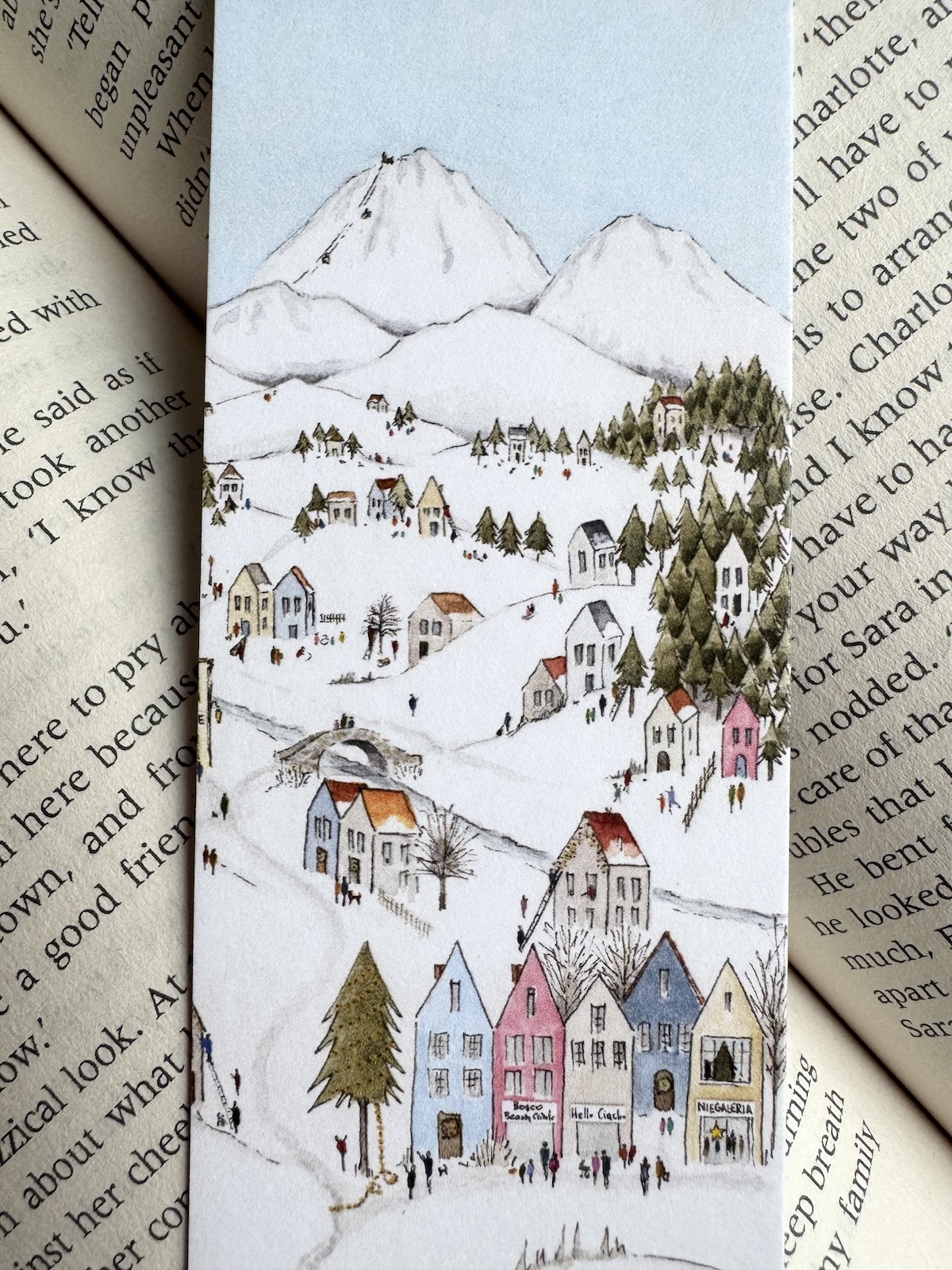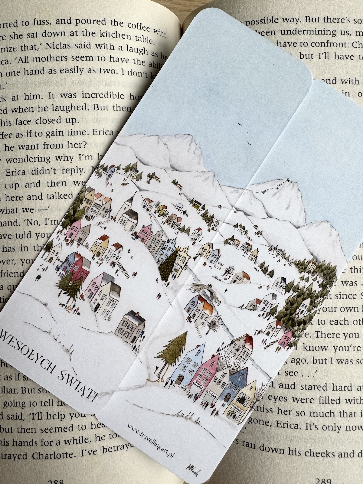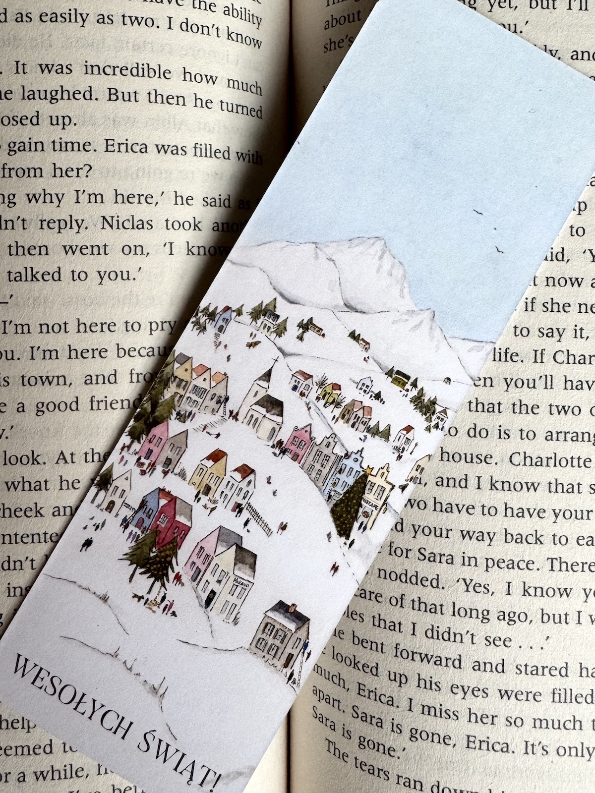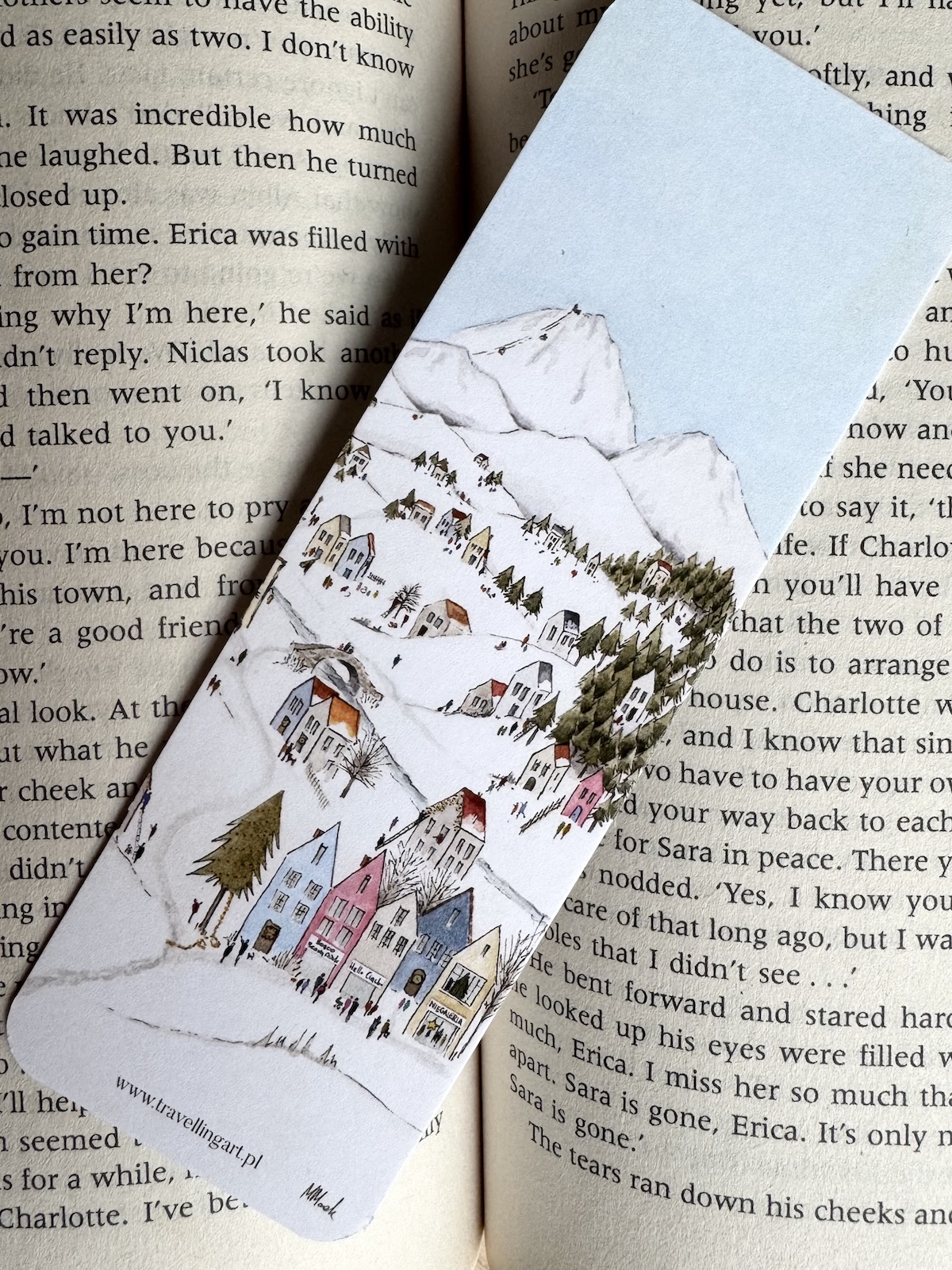 Zakładka drukowana dwustronnie – każda strona inna. Obie tworzą całe dobre miasteczko.