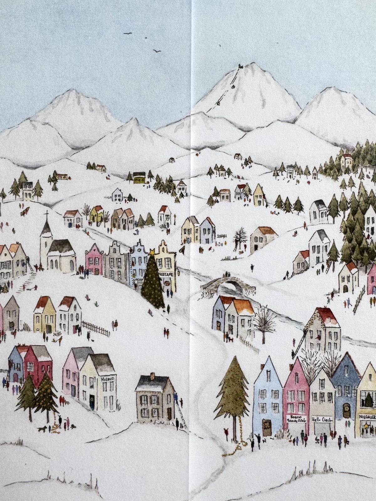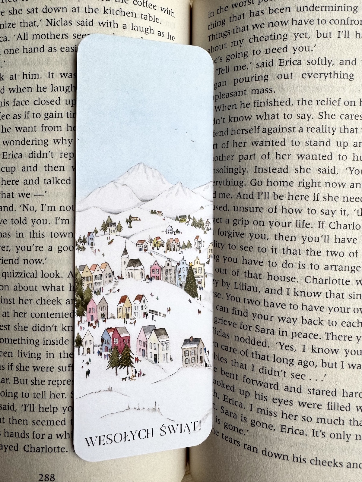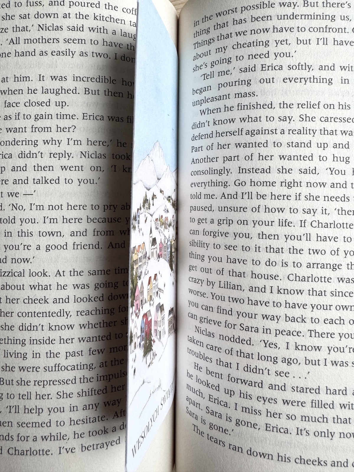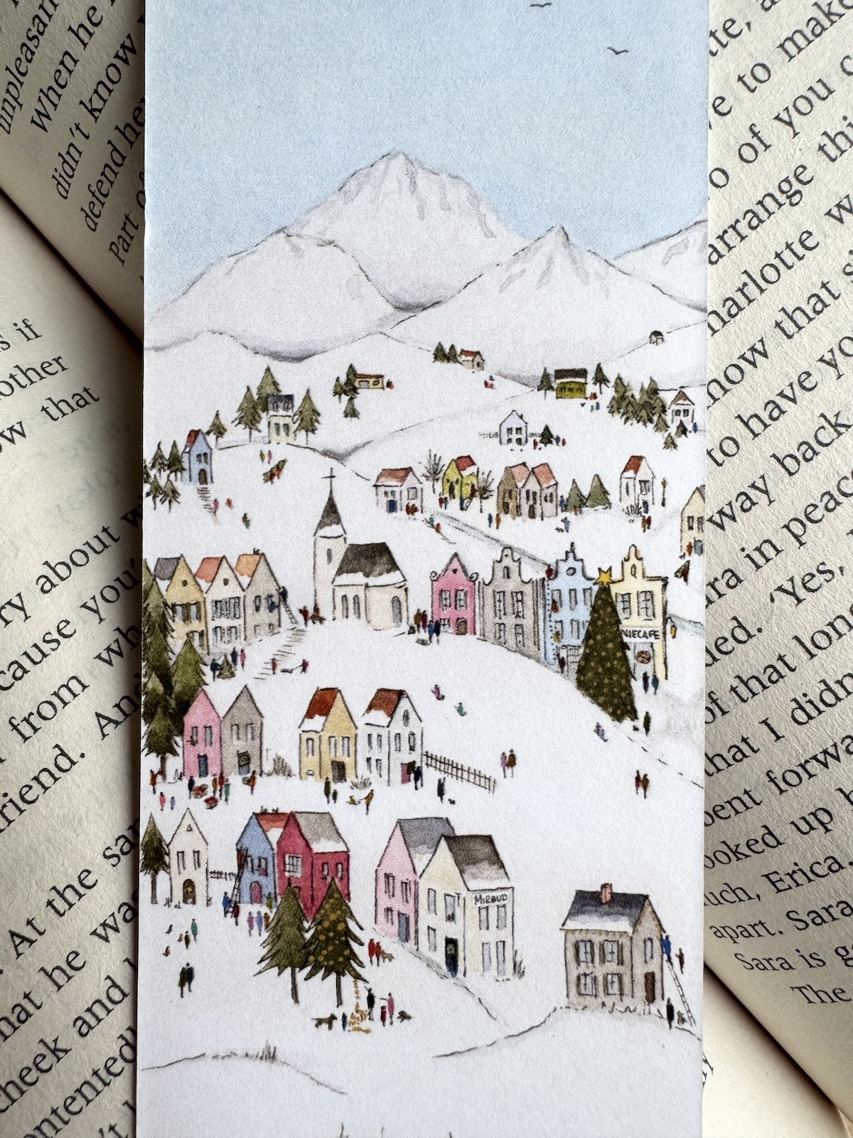 Zakładka drukowana dwustronnie – każda strona inna. Obie tworzą całe dobre miasteczko.